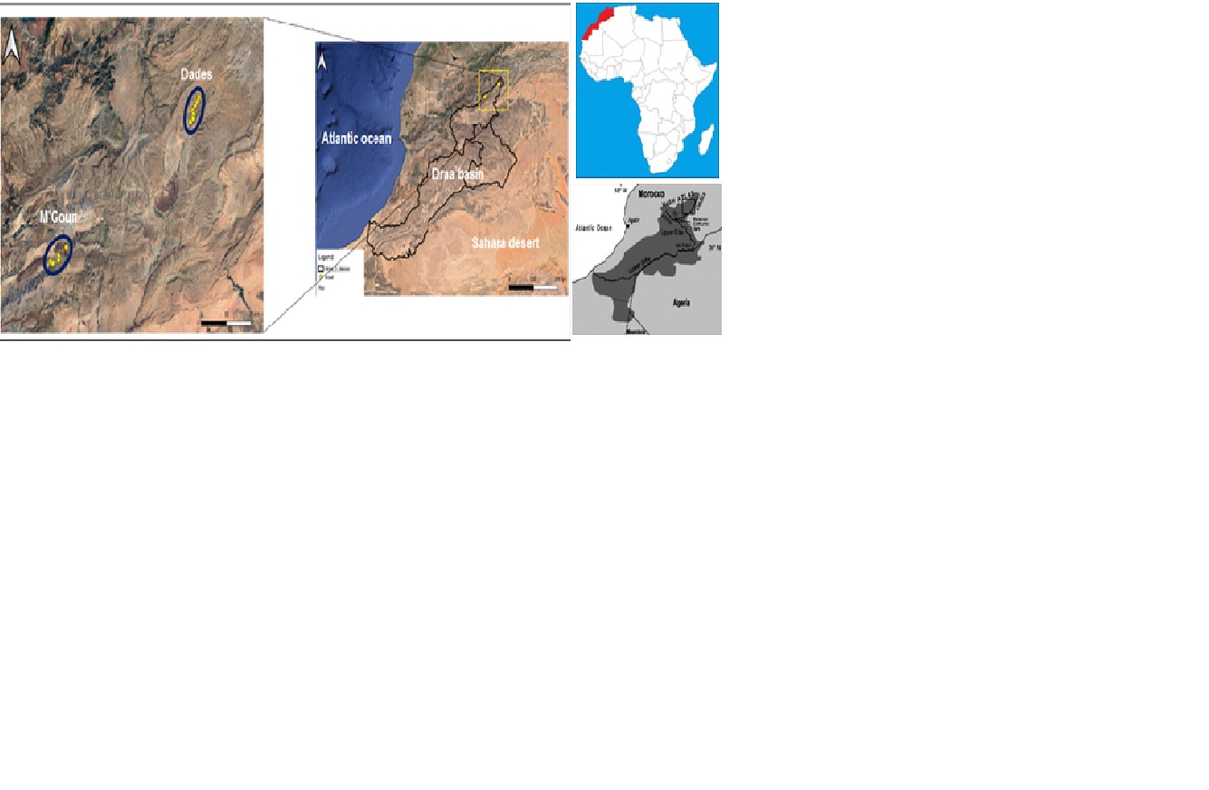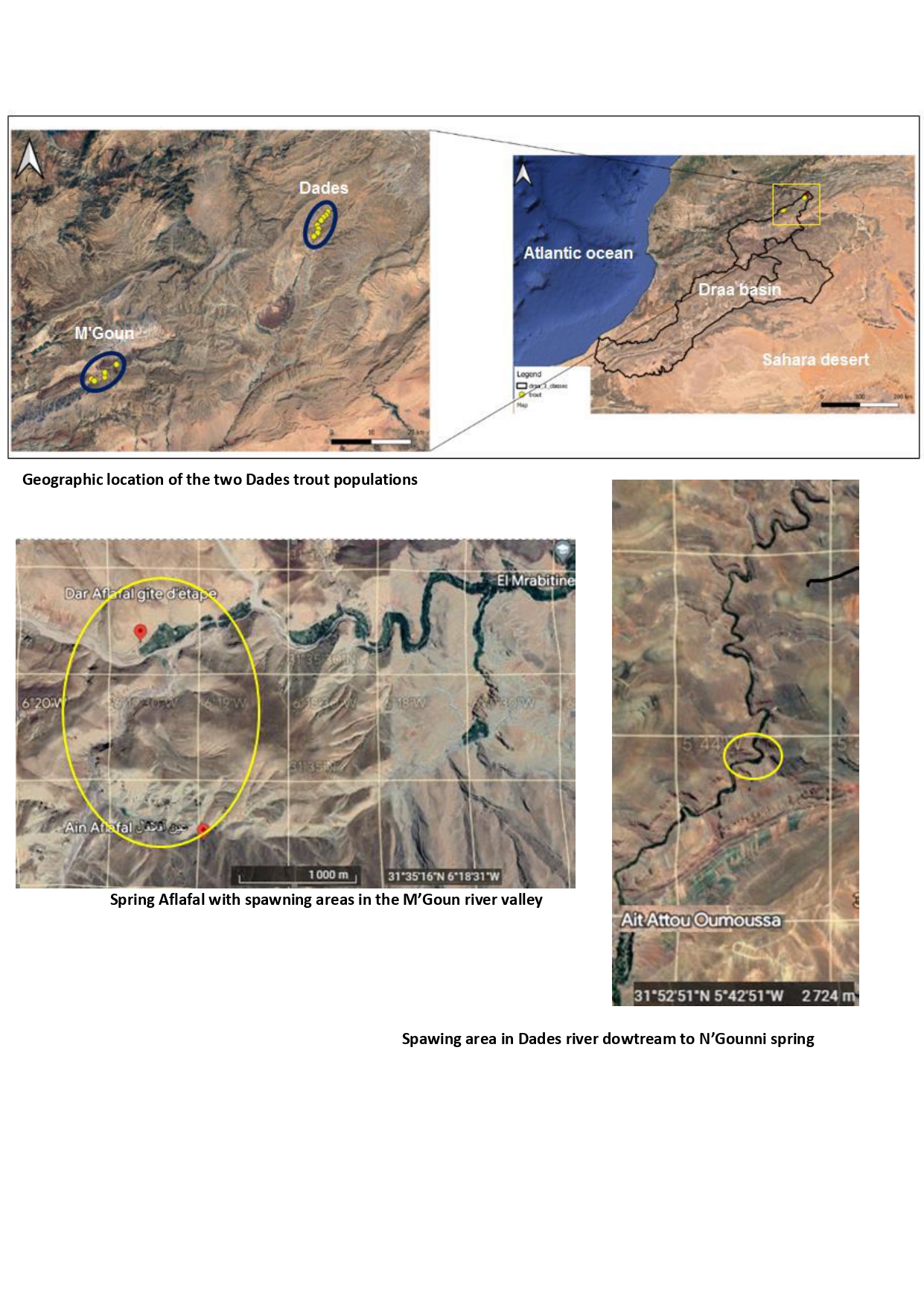 - Maps showing the distribution range of the Dades trout and the locations of the sapawning upstream cold-water sites