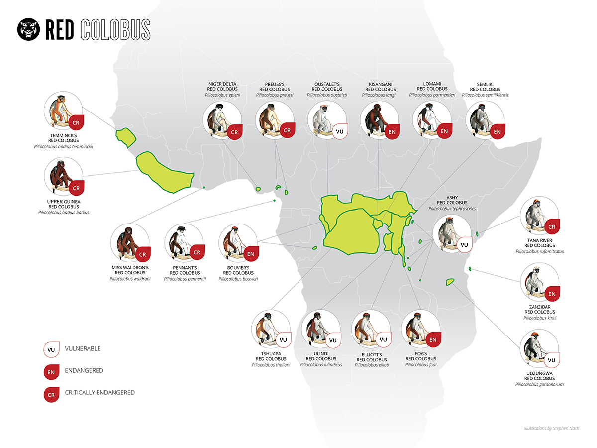 Red Colobus monkeys (Piliocolobus spp.) are the most threatened group of primates in Africa with more than half Endangered or Critically Endangered with one possibly hunted to extinction. Red colobus range overlaps with at least 75% of all primate species on mainland Africa.
