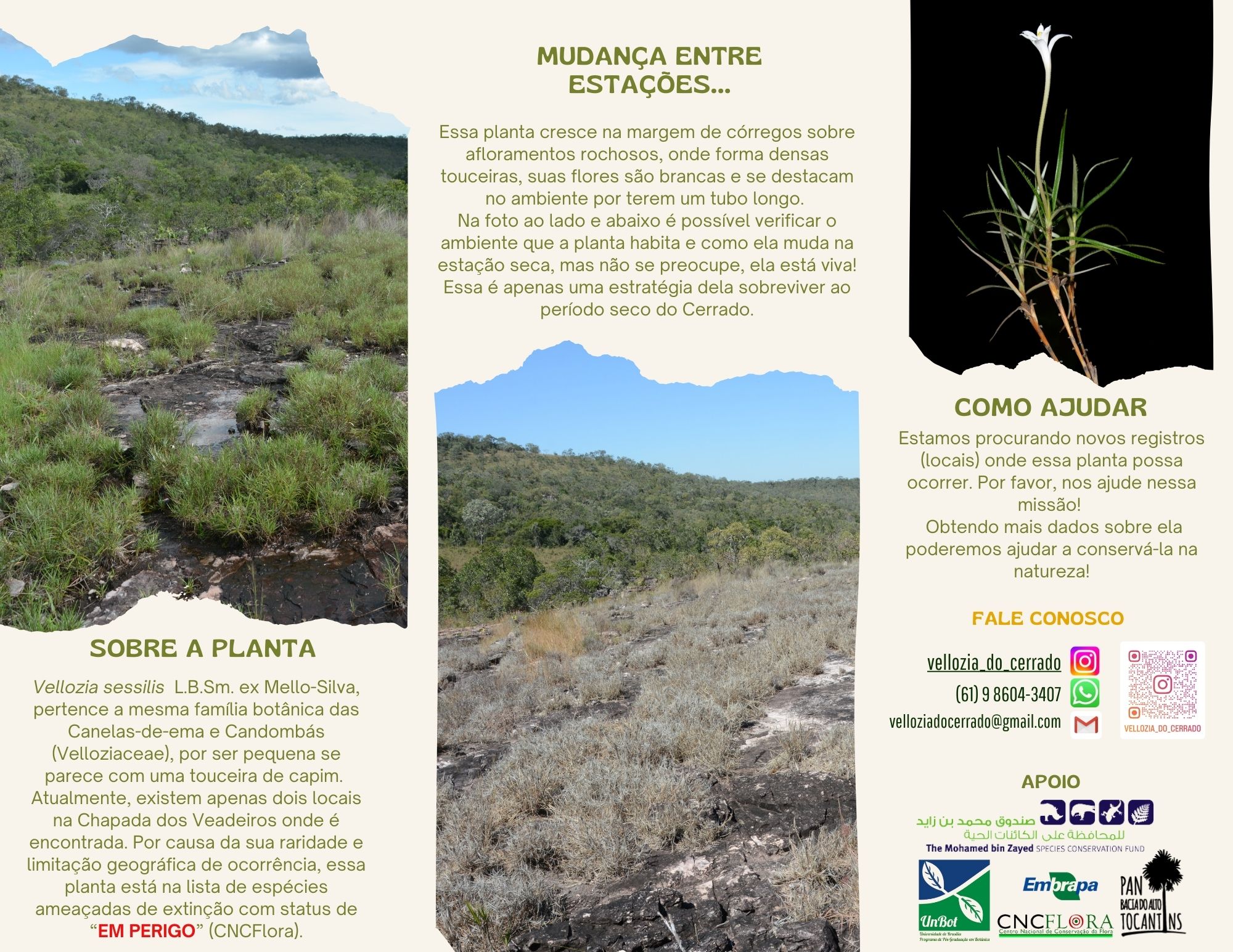 1) Perform fieldwork to search for new populations of V. sessilis and collect data on population size, type of environment, and possible associations with other species of Vellozia in the same area;